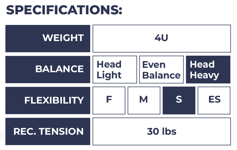 The head-heavy balance provides extra power in offensive play, while the stiff flexibility ensures precise and controlled feedback during shots.