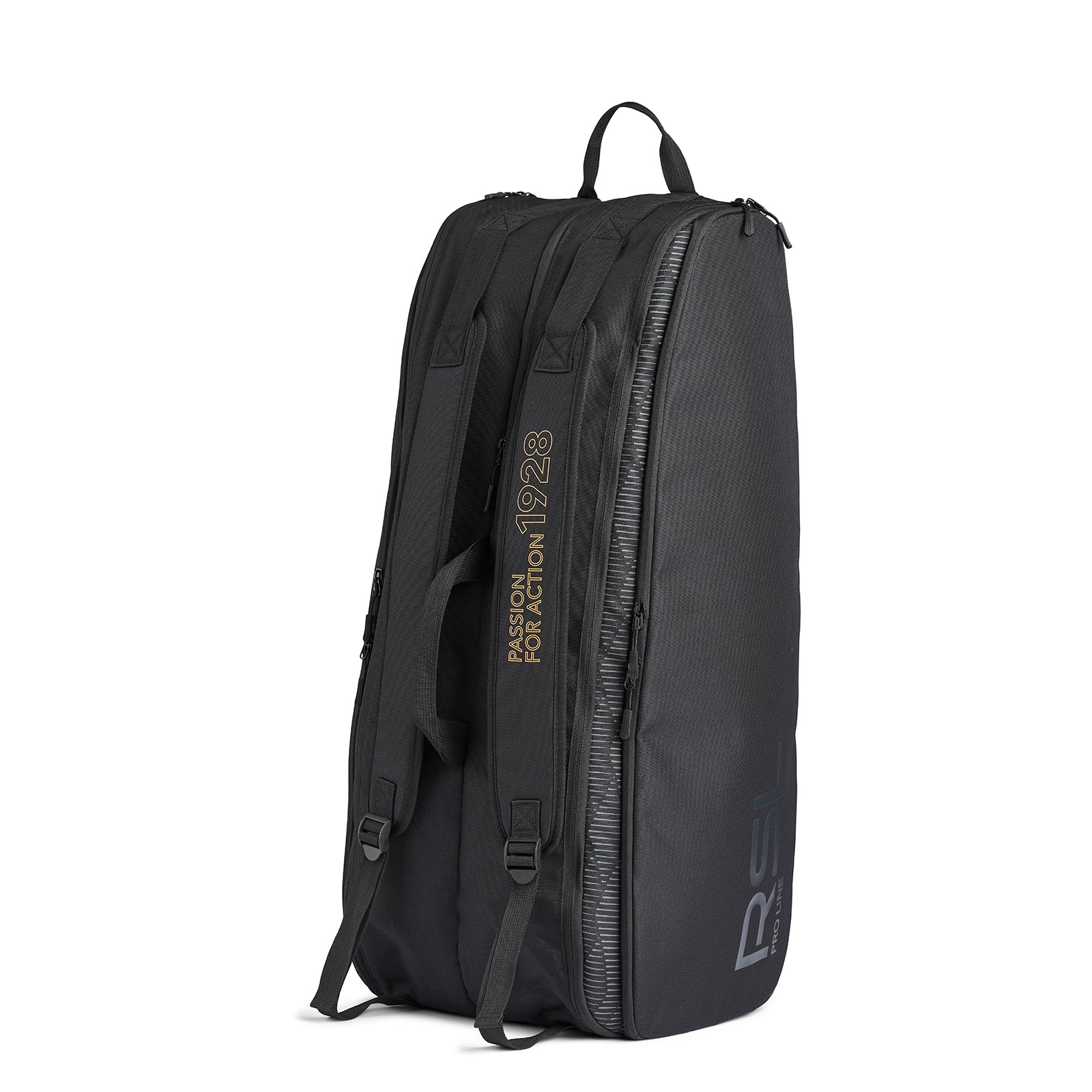 The RSL Pro Line 6 Racket Bag in Black features two main compartments and two straps for carrying convenience. It includes 4 side pockets for additional storage. Inside, you'll find two spacious compartments, with one designed as a thermo compartment, along with a shoe compartment on top and smaller compartments on each side. The bag is equipped with one handle and two adjustable shoulder straps, allowing for easy backpack-style carrying. With dimensions of 72.5 x 30 x 24.5 cm, this bag accommodates all your essentials comfortably. Crafted from flexible materials, it ensures a comfortable fit on your back.